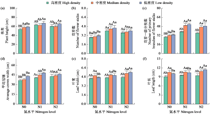由图1可知,高、低密度下,2个施氮处理红根草的株高均显著高于N0处理;中密度下,各施氮处理的株高无显著差异。N0处理下,中、低密度红根草的株高无显著差异,但均显著高于高密度;N1和N2处理下,高、中密度红根草的株高无显著差异,均显著低于低密度。各氮处理下,密度对红根草的花苔数影响均不显著;各密度下,2个施氮处理的花苔数均显著高于N0处理。各密度下,2个施氮处理的花苔分枝数均显著高于N0处理;各氮处理下,中、低密度红根草的花苔分枝数无显著差异,但均高于高密度。各密度2个施氮处理的平均冠幅均显著高于N0处理;各氮处理下,平均冠幅随密度的降低而显著增大。除低密度下高氮处理的叶宽、叶长显著高于N1和N0处理外,高、中密度下各氮处理的叶宽和叶长均无显著差异;除N0处理下中密度的叶长和叶宽均显著高于低、高密度外,各氮处理,中、低密度的叶宽和叶长均无显著差异,但均显著高于高密度。