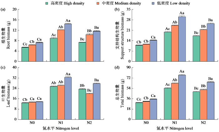 各密度下,N1处理红根草的根生物量、支持结构生物量、叶生物量和总生物量均显著大于N2与N0处理,而N2处理又显著大于N0处理;各施氮处理下,红根草根生物量、支持结构生物量和总生物量均随密度的降低而显著增大(图2)。N0处理下,中、低密度红根草的叶生物量无显著差异,但均显著大于高密度;N1处理下,中、高密度红根草的叶生物量无显著差异,但均显著小于低密度;N2处理下,高密度红根草的叶生物量显著大于中密度,但显著小于低密度。