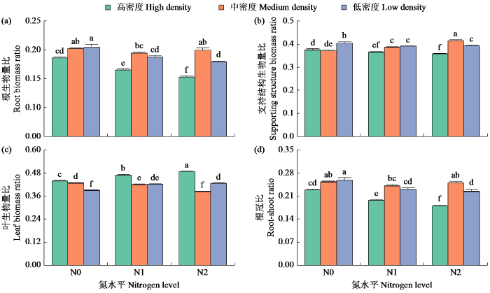 双因素方差分析表明密度与施氮交互作用极显著影响红根草的生物量分配参数(表1),不同处理组合的单因素方差分析结果如图3所示,其中,红根草的根生物量比和根冠比的变化趋势一致,低、高密度的根生物量比和根冠比均随施氮量的增高而显著降低,中密度下不同氮处理间无显著差异;N0处理下,中、低密度的根生物量比和根冠比均无显著差异,但均显著大于高密度;N1和N2处理下,中密度的根生物量比和根冠比均最高,高密度最低;高、低密度下,N0处理红根草的支持结构生物量比显著高于2个施氮处理,中密度下反之;N0处理下,低密度的支持结构生物量比最高;N2处理,中密度的支持结构生物量比最高,不同处理组合中,中密度N2处理的支持结构生物量比最高,高密度高氮处理的支持结构生物量比最低。高、低密度下,红根草的叶生物量比均随施氮量的增大而显著增大,中密度下反之;各氮处理下,高密度的叶生物量比均显著大于低密度;不同处理组合中,高密度高氮处理的叶生物量比最高,中密度高氮处理的叶生物量比最低。