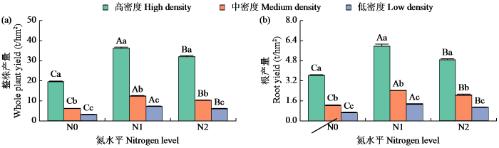 如图4所示,各密度下,N1处理红根草的整株产量与根产量均显著大于N2和N0处理,而N2处理又显著大于N0处理;各施氮处理下,高密度红根草的整株产量与根产量均显著大于中密度和低密度,而中密度又显著大于低密度。