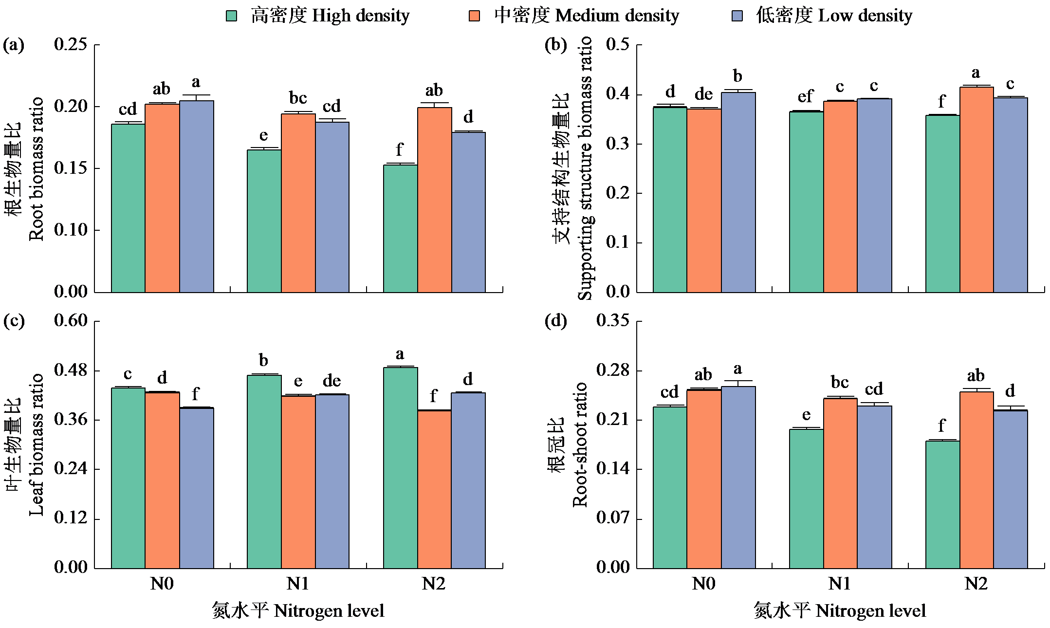| 图3 密度与施氮水平对红根草生物量分配的影响 不同小写字母代表不同处理组合间差异显著(P < 0.05)。 |