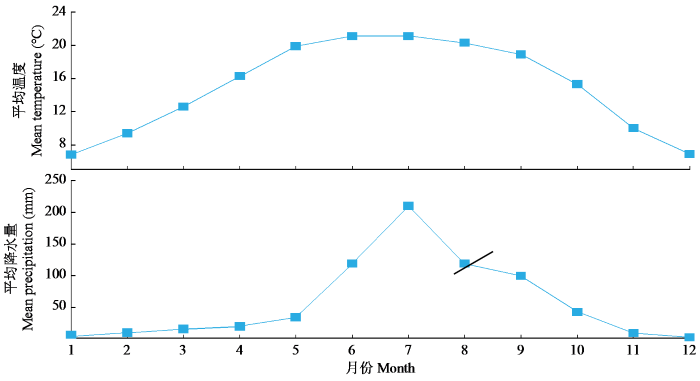 试验于云南省丽江市玉龙纳西族自治县巨甸镇(27.30° N,99.65° E)进行,该地海拔1878.74 m,最高月均温度21.1 ℃,最低月均温度6.8 ℃,年均温度15.0 ℃;年均相对湿度63%,年降水量767.5 mm,6-9月为雨季,降水量占全年的82%以上(图1);太阳辐射较强,年日照时长在2500 h以上。土质为沙壤土,0~20 cm土层土壤有机质含量35.66 g/kg、全氮2.86 g/kg、全磷1.47 g/kg、全钾9.13 g/kg、速效氮0.35 mg/kg、速效磷30.62 mg/kg、速效钾100.68 mg/kg、含水率26.86%、pH 6.7。