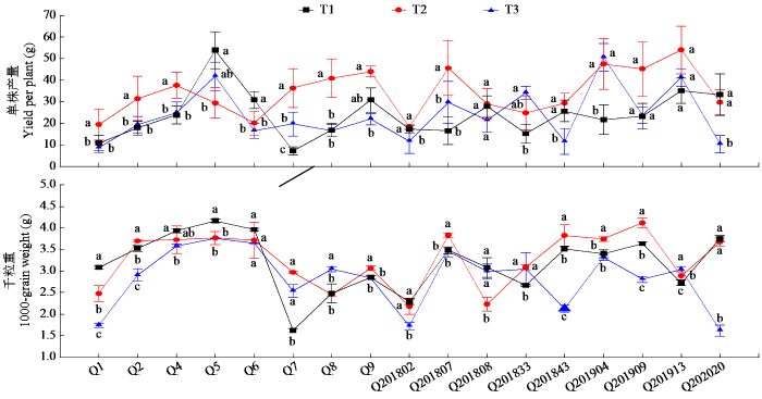 由表2和图2可知,T1处理不同藜麦品系的平均株高在68.00~124.20 cm,平均茎粗在10.07~ 15.14 mm,平均主穗长在15.40~31.60 cm,平均有效分枝数在6.08~20.40,平均单株产量在7.30~ 53.89 g,平均千粒重在1.62~4.16 g,生育期在189~ 196 d。T2处理不同藜麦品系的平均株高在106.80~ 171.00 cm,平均茎粗在10.88~18.07 mm,平均主穗长在17.00~45.40 cm,平均有效分枝数在6.80~ 16.60,平均单株产量在18.25~47.49 g,平均千粒重在2.18~4.11 g,生育期在165~178 d。T3处理不同藜麦品系的平均株高在111.80~176.40 cm,平均茎粗在11.99~16.98 mm,平均主穗长在17.00~39.40 cm,平均有效分枝数在6.80~14.60,平均单株产量在8.79~50.68 g,平均千粒重在1.62~3.76 g,生育期在165~178 d。