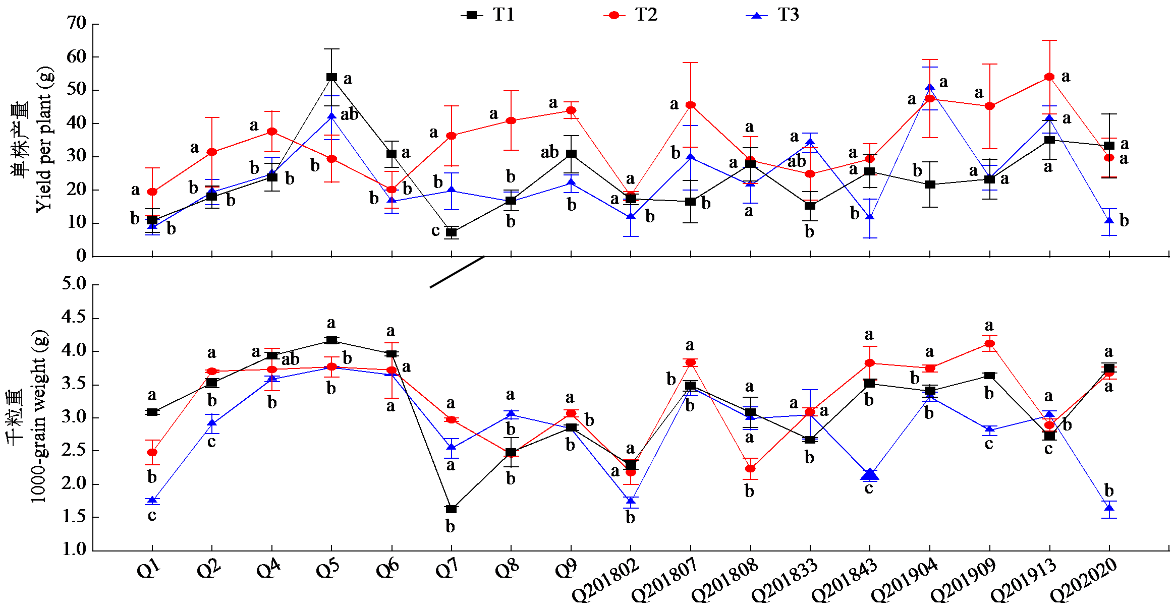 | 图2 不同播期藜麦品系的单株产量和千粒重 不同小写字母表示差异显著(P < 0.05)。 |