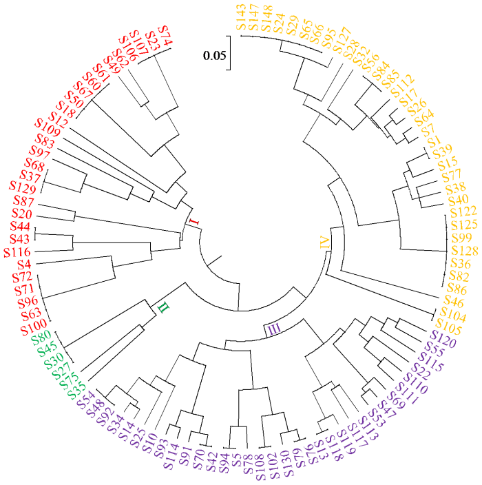 本研究运用UPGMA聚类分析方法,将104份苦荞种质资源划分为4个组群。从地理来源角度分析,内蒙古、云南、贵州和四川的苦荞种质分布情况相似,主要集中于组群Ⅲ和Ⅳ,表明内蒙古与云贵川地区的苦荞亲缘关系较近,其余省份的苦荞种质分布相对均匀,说明可能存在同物异名情况。综上,104份苦荞种质资源具有较为丰富的遗传多样性。通过群体遗传结构分析,104份苦荞种质资源同样被划分为4个组群,其中组群A含25份种质,组群B含20份,组群C含23份,组群D含36份。进一步分析发现,组群Ⅰ与组群B有19份种质重合,组群Ⅱ与组群D有5份重合,组群Ⅲ与组群D有25份重合,组群Ⅳ与组群A、组群C分别有14份、19份种质重合。在104份种质资源中,20份Q值<0.6,84份Q值≥0.6,表明各组群内多数资源材料的亲缘关系相对单一,基因渗透较少。其中,组群B中有17份种质(S18、S23、S49、S50、S60、S61、S62、S63、S67、S71、S72、S74、S96、S97、S100、S106和S107)Q值≥0.9,占组群B材料总数的85%,为4个组群中Q值≥0.9种质占比最高者,显示出这17份种质亲缘关系极为单一,适合作为后期亲本筛选及新品种选育的材料。