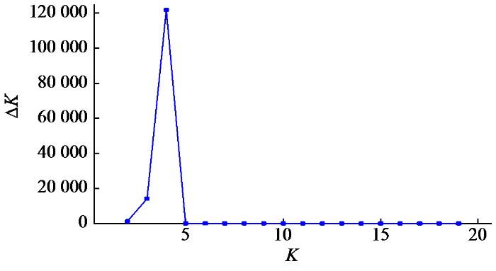 使用Structure 2.3.1软件分析供试材料的群体遗传结构,将群体数目预测值K设置为1~20,MCMC(Markov chain Monte Carlo)和不作数迭代次数分别设置为50 000和100 000,每个K值重复运行20次;将运行结果导入在线程序structure Harvester(