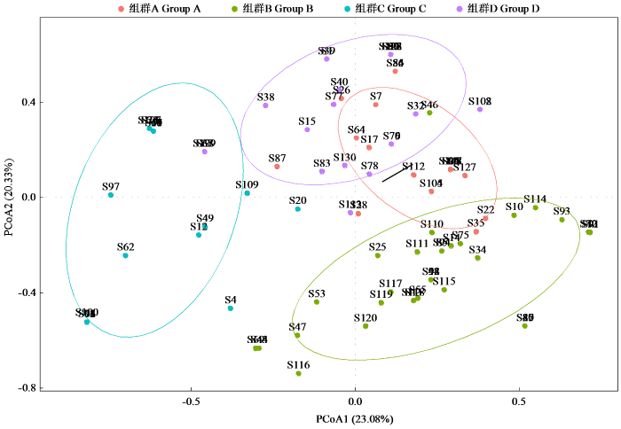 采用二维主坐标分析(PCoA)对群体遗传结构进行验证,结果基本一致。组群B中的资源材料均位于蓝色区域内,与其他区域几乎无重叠,证明组群B内种质资源亲缘关系单一,且与其他组群材料亲缘关系较远。