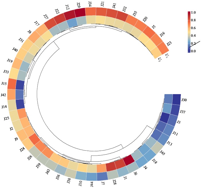 将45份水稻材料进行聚类分析(图2),分为4种类型,其中J23、J16、J5、J20、J35、J32、J41、J21、J34、J29、J12、J22和J27归为一类,共13份材料,为耐冷型;J17、J8、J31、J40、J19、J33、J15、J42和J14归为一类,共9份材料,为较耐冷型;J4、J18、J45、J13、J11、J3、J37和J30归为一类,共8份材料,为冷敏感型;其余15份归为一类,为冷较敏感型。