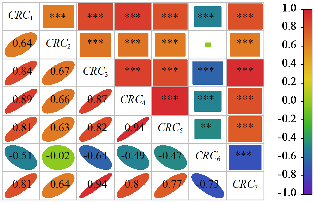 | Fig.1 Correlation analysis of cold tolerance coefficients of 45 rice materials at germination stage “**”and“***”indicate extremely significant correlations at the P < 0.01 and P < 0.001 levels, respectively. |