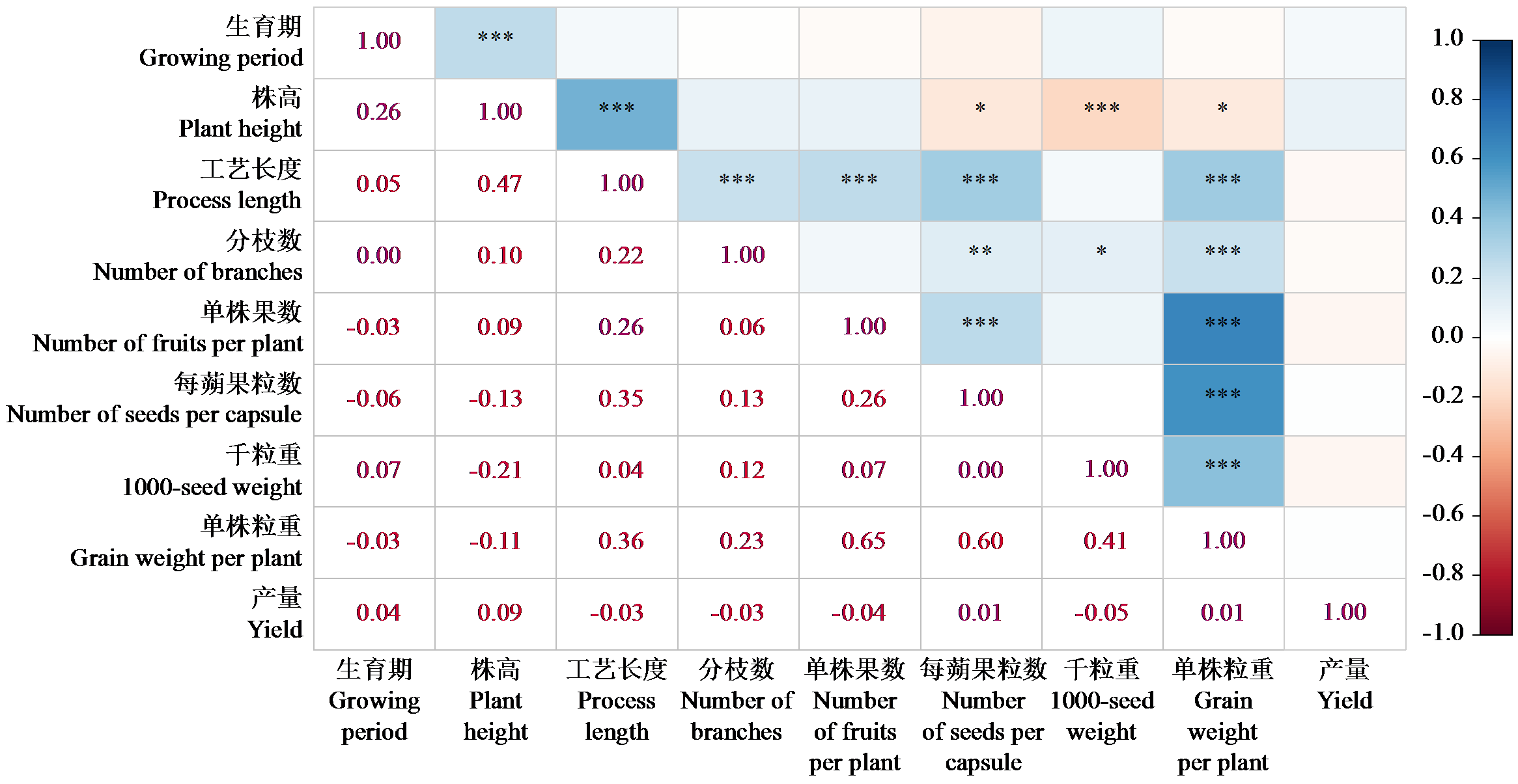 | Fig.1 Correlations among agronomic traits across 387 flax germplasm resources “***”,“**”and“*”indicate significant difference among the treatments at P < 0.001, P < 0.01, and P < 0.05 levels, respectively, the same below. |